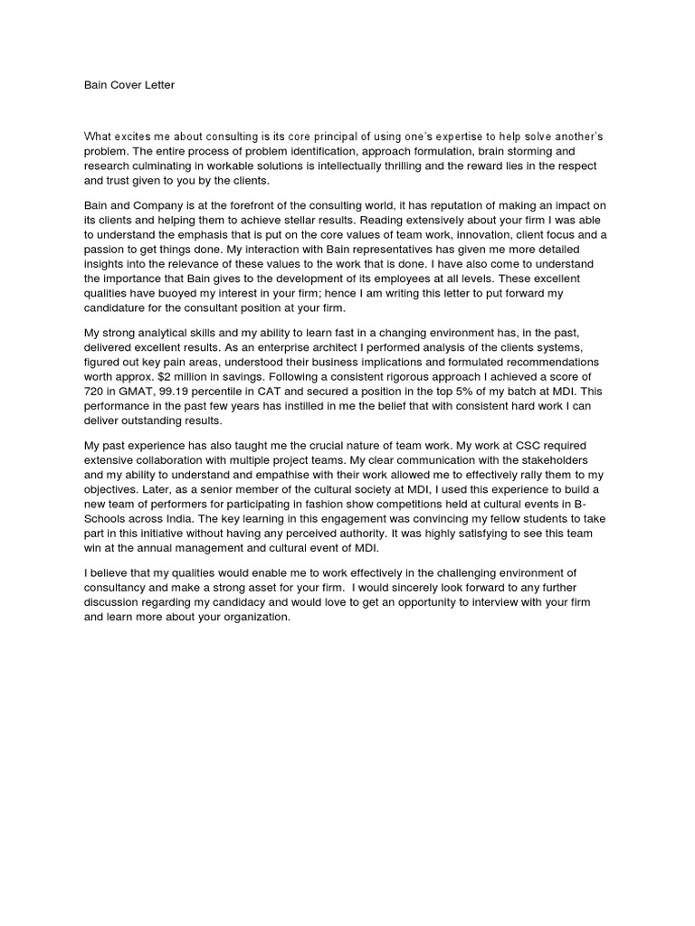 Bain Cover Letter Sample. My thinking on cover letters is that if you have something substantive to say, include it. The cover letter becomes an important data point on how good they are at certain skills that might be bain uses cookies to improve functionality and performance of this site. Consulting firms selected which primary candidates that they wanted to interview from the. Go to the bain careers page and read about what they're looking for in. The consulting cover letter is a separate document from your resume; Consulting cover letters are actually very different to cover letters for other jobs. The most important thing you need to remember for this section is accuracy. So let's step and let's also review a cover letter sample that landed interviews with mckinsey, bcg and bain. So if you're writing a cover letter for a bain job, what should you write to demonstrate you know not only a lot about the firm but something interesting that distinguishes it from the rest? It puts the work experience yes, you read that right. Access our database of cover letters for internships and recent grad positions. As the recruiter will use the details you provide here to notify. With a great cv, your consulting cover letter can open the door to scoring an interview and thus, in this article i'll show how to write a persuasive and customized cover letter that will move your job. *** successful bain cover letter contributed by a cover letter library member for bain & company associate consultant *** bain cover letter november 1, 2015 to whom it may concern, re: View a real cover letter for the bain & company full time position, associate consultant.