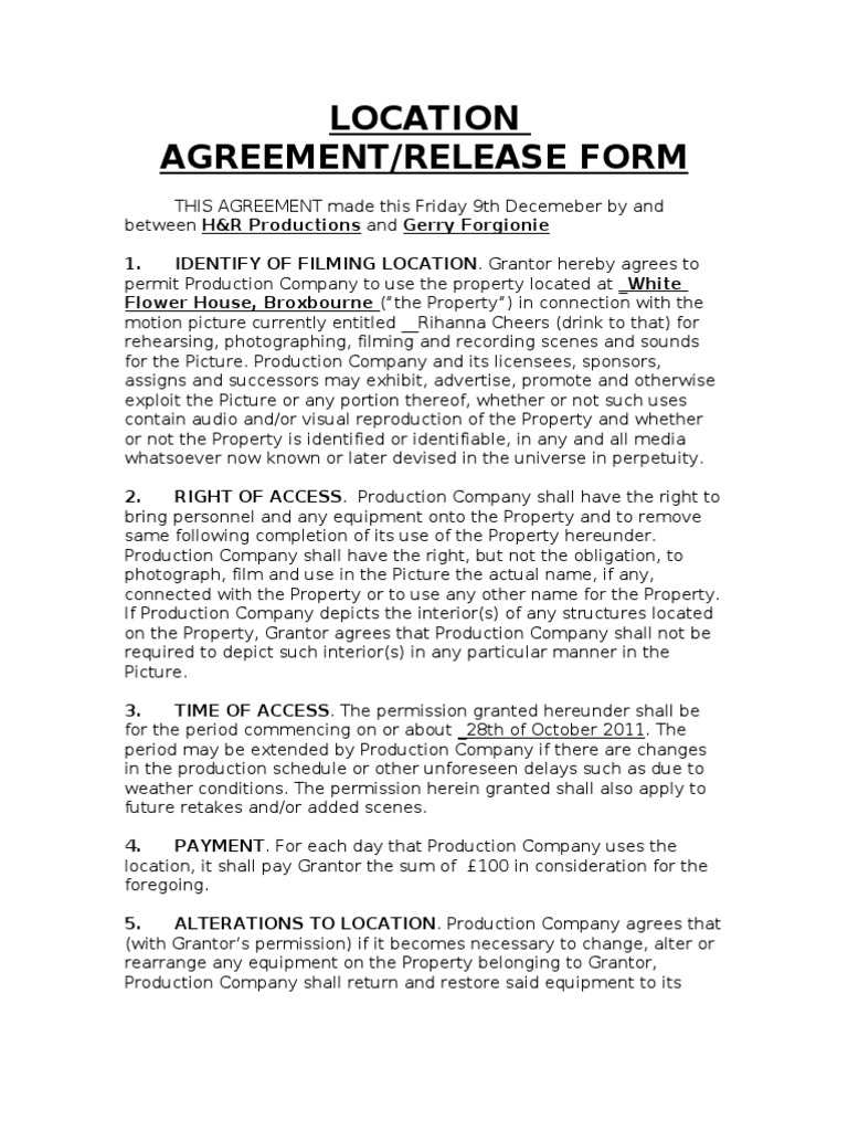 Download Free Film Location Release Form Template . Email, Download Or Print Instantly.